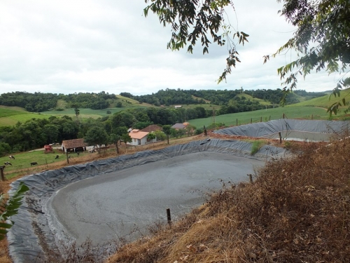 Na propriedade existe uma cisterna com captação de água pluvial, com capacidade de 200 mil litros (foto abaixo).