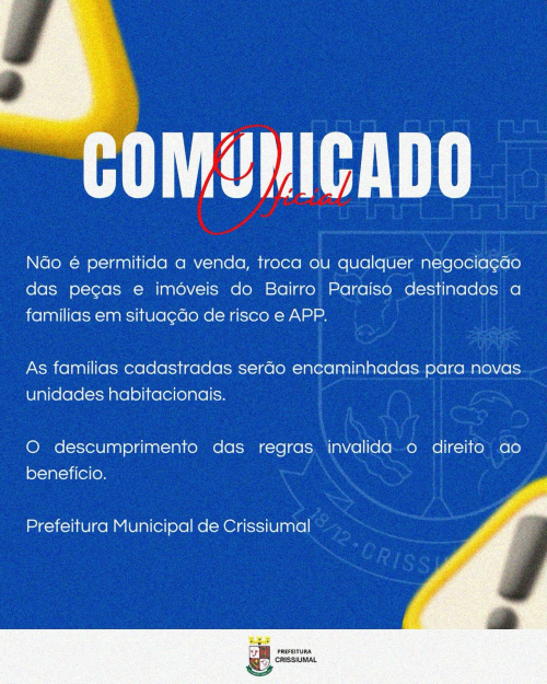 “A Administração Municipal de Crissiumal informa que não é permitida a venda, troca ou qualquer forma de negociação das peças e imóveis do Bairro Paraíso destinados a famílias em situação de risco e APP.