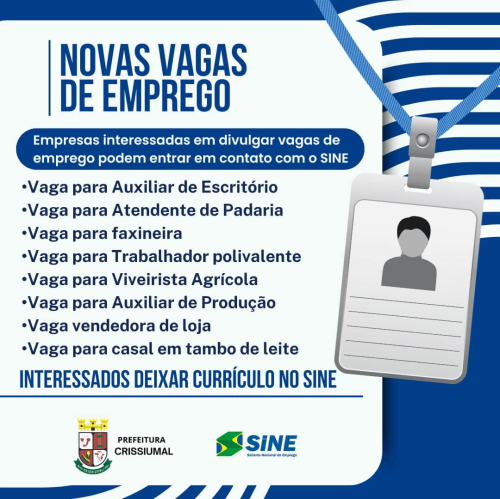 Interessados devem entregar o currÃculo diretamente no SINE de Crissiumal