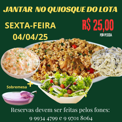 Cardápio: Galinhada, massa, batatinha, maionese, saladas diversas e sobremesas