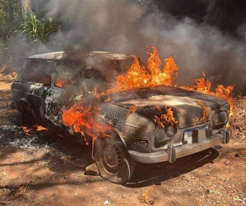 Bombeiros utilizam água e espuma para controlar chamas em automóvel com compostos metálicos inflamáveis