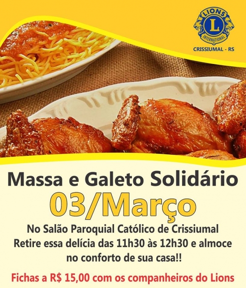 O LIONS CLUBE de Crissiumal promove mais uma edição da “Massa e Galeto Solidário”, cujo lucro irá beneficiar entidades assistenciais de Crissiumal.