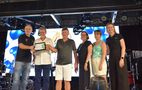 Pérsio Schweig e Sheila Fockink da Sicredi fizeram e entrega no intervalo dos shows ao prefeito Marco Aurélio Nedel, à primeira-dama Vera Trasel Nedel, ao vice Otavio Luiz Wehrmeier e sua esposa Jocelane Wille.