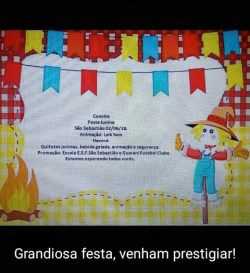 Com organização da Escola Estadual São Sebastião e do Guarany FC, acontece nesse sábado (02) à noite a tradicional festa junina de São Sebastião.