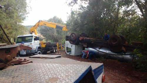 Um caminhão de transporte de leite capotou, ficando com as rodas para o alto no interior de Nova Candelária neste domingo (01).