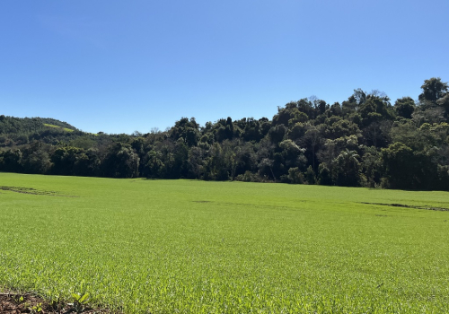 Os cultivos semeados entre o final de maio e durante o mês de junho estão, majoritariamente, no estádio de perfilhamento; algumas áreas mais adiantadas começam a fase de elongação do colmo; as demais seguem em desenvolvimento vegetativo. Observa-se homogeneidade no porte das plantas, e o estande final é considerado adequado. Porém, e pequenas áreas, especialmente onde a erosão superficial foi mais intensa, houve comprometimento parcial da emergência ou da fixação das plântulas, reduzindo a densidade das plantas.