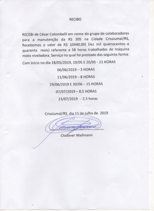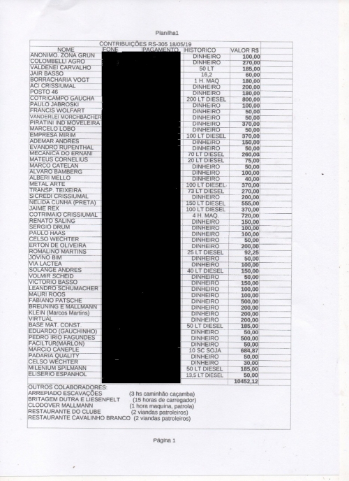 “Em nome da comissão pro RS 305, venho por meio desta, agradecer o apoio na ação de manutenção da RS 305, peço desculpas pela demora na prestação de contas. Segue abaixo lista de colaboradores, e comprovante de uso dos recursos arrecadados”, destacou Cesar Colombelli, que acabou passando por um problema de saúde que o impossibilitou de fazer a prestação de contas antes.