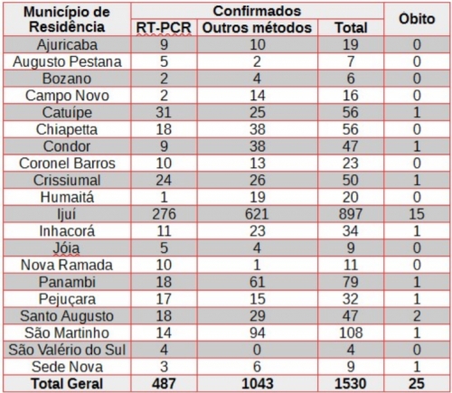 A região R13 possui 1530 casos, com 25 óbitos, um deles em Crissiumal.