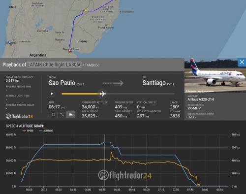 Segundo sites de monitoramento de voos, A aeronave A320 (uma das mais usadas no mundo), partiu de Guarulhos à 1h51 (de Brasília) e seguia normalmente seu voo até as 3h11, quando sobrevoava no noroeste do Rio Grande do Sul, fez uma curva atípica para este voo para a direita. Logo depois, já na fronteira com a Argentina, a aeronave ganhou altitude, possivelmente para desviar de uma tempestade.