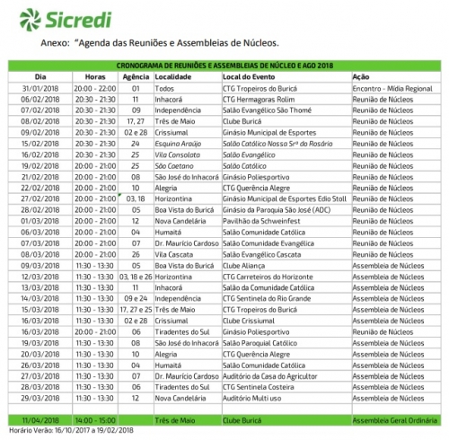 No período de 06/02/2018 a 11/04/2017, a Sicredi Noroeste RS reunirá os associados