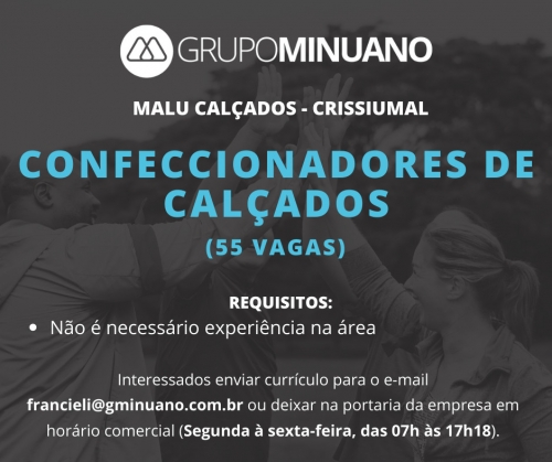 A Calçados Malu de Crissiumal (Grupo Minuano) seleciona 55 confeccionadores de calçados.