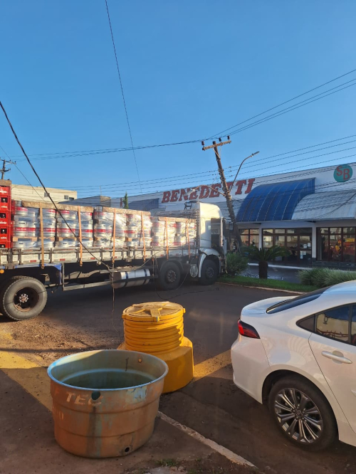 O veículo carregado com barris de chope disparou do pátio de uma empresa nas imediações sem motorista e só parou ao se chocar contra o poste, que ficou danificado, quebrando em sua parte inferior.