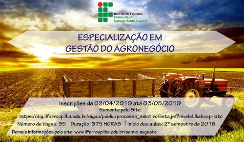 O IFFar – Campus Santo Augusto está com inscrições abertas até esta sexta-feira, dia 03, para o curso de Especialização em Gestão do Agronegócio, através do site https://sig.iffarroupilha.edu.br/sigaa/public/curso/lista.jsf?nivel=L&aba=p-lato