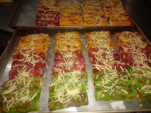 Panquecas doces e salgadas. Com massas de beterraba, folhas verdes e tradicional.