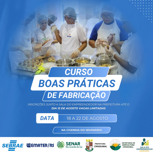 Estão abertas até o dia 12 de agosto as inscrições para o Curso de Boas Práticas de Fabricação em Crissiumal, uma iniciativa voltada à qualificação na produção de alimentos com qualidade e segurança.