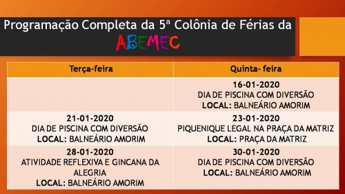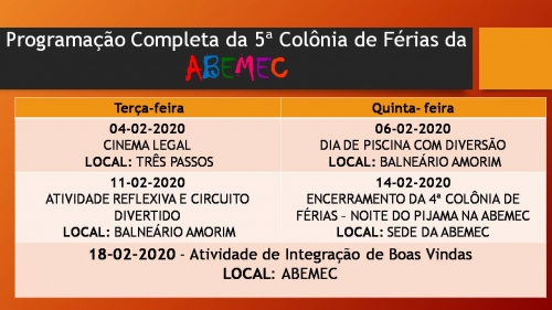 Geral - 03/01/2020 - ABEMEC divulgou a programação completa da V Colônia de Férias