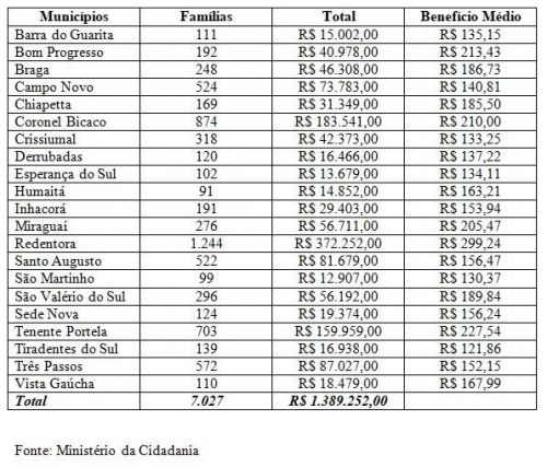 Dados disponibilizados pelo Governo Federal e compilados pela reportagem do site Clic Portela mostram que, em janeiro, 7.027 famílias residentes na Região Celeiro tiveram direito ao complemento de renda, o que representa um montante de R$ 1.389.252,00. Crissiumal teve 318 famílias no programa.