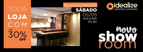 A empresa crissiumalense Idealize Ambientes e Projetados convida a população para conhecer seu novo Showroom e aproveitar a promoção com descontos incríveis de 15 a 30% em toda a loja, neste sábado (05) das 08h30min às 16h00min na loja localizada na Rua XV de Novembro no centro de Crissiumal.