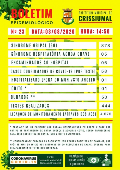 Crissiumal tem agora 58 casos de coronavírus. Quatro novos casos foram confirmados nessa quinta-feira (03) no boletim semanal divulgado pela Secretaria Municipal da Saúde.