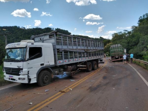 De acordo com informações colhidas por nossa reportagem, o motorista de um caminhão carregado com combustível perdeu os freios e acabou batendo contra um caminhão utilizado no transporte de suínos e uma carreta carregada com madeira.