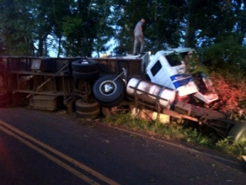 Uma carreta carregada de tabaco saiu da pista em uma curva acentuada atingindo um barranco.