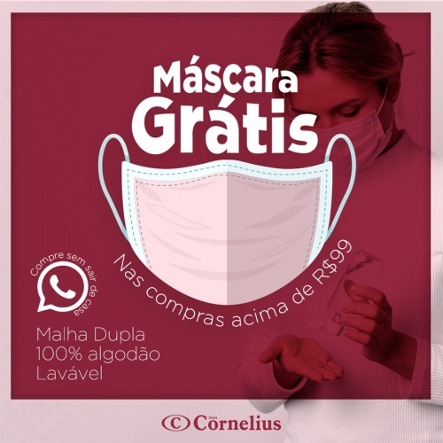 As Lojas Cornelius buscam colaborar o máximo possível no combate ao Covid-19, além de seguir todas as Normas da OMS, disponibilizar entrega gratuita na sua casa, agora também estamos fornecendo máscaras Reutilizáveis de malha dupla de 100% algodão nas compras acima de R$99,00. Conte sempre com a gente!