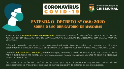 - o uso de máscaras é obrigatório para qualquer pessoa que adentrar em qualquer tipo de estabelecimento de Crissiumal a partir de hoje.
