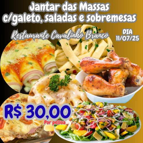O Restaurante Cavalinho Branco realiza no dia 11 de julho, jantar das massa com galeto, saladas diversas e sobremesas, ao valor de R$ 30,00 por pessoa. Crianças até 05 anos não pagam.