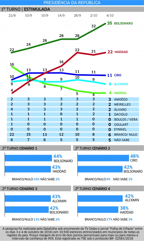 Pesquisa Datafolha sobre a disputa à presidência da República divulgada nesta quinta-feira indicou crescimento do candidato do PSL, Jair Bolsonaro, que passou de 32% para 35% na comparação com o levantamento da antevéspera. Segundo colocado, Fernando Haddad (PT) oscilou positivamente de 21% para 22%. A terceira colocação tem um empate técnico entre Ciro Gomes (PDT), que teve 11% e Geraldo Alckmin, com 8%. A margem de erro é de dois pontos percentuais para mais ou para menos.