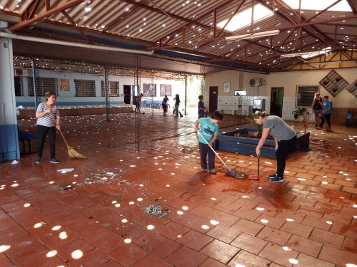 Na Escola Rocha Pombo, durante a tarde um mutirão de direção, funcionários, professores, alunos e ex-alunos iniciou a cobertura com lona de algumas partes do educandário.