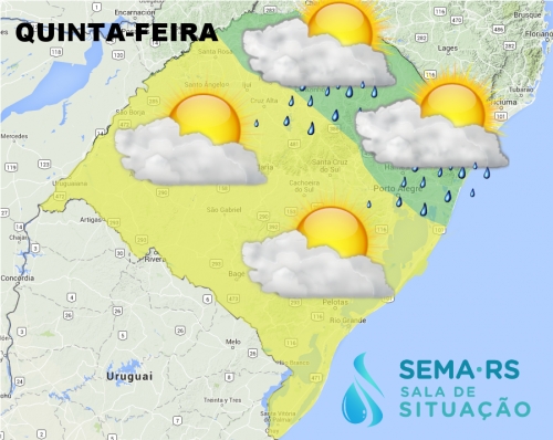 Nessa quinta (05) a instabilidade ainda mantém as condições de chuva na parte norte, noroeste, nordeste e pontos isolados do leste, pelo menos na primeira metade do dia. Depois aos poucos o tempo firme deve voltar a predominar.