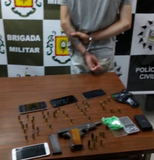 O indivíduo de 19 anos, era investigado pelos agentes civis e foi surpreendido pela ação policial. Nas buscas, foram localizados 42,6 gramas de cocaína na pedra, uma pistola calibre 45 sem numeração, munições de vários calibres e celulares. Todo o material apreendido estava escondido na residência de F.L.S.