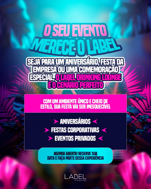 * EVENTOS SOCIAIS: seja uma festa de aniversário, um chá de bebê, um batizado ou qualquer outra celebração social, o Label Drinking Lounge oferece o cenário perfeito para reunir familiares e amigos em um ambiente acolhedor e bem equipado.