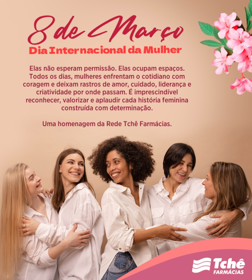 8 de Março dia Internacional da Mulher. Elas não esperam permissão. Elas ocupam espaços. Todos os dias, mulheres enfrentam o cotidiano com coragem e deixam rastros de amor, cuidado, liderança e criatividade por onde passam. É imprescindível reconhecer, valorizar e aplaudir cada história feminina construída com determinação. Uma homenagem da Rede Tchê Farmácias