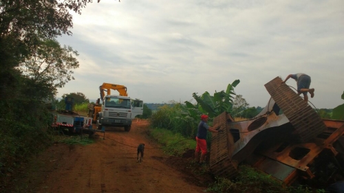 A H Resgate e Serviço de Guincho de Crissiumal trabalho neste sábado (05) na remoção de uma escavadeira giratória que tombou no interior de Horizontina.
