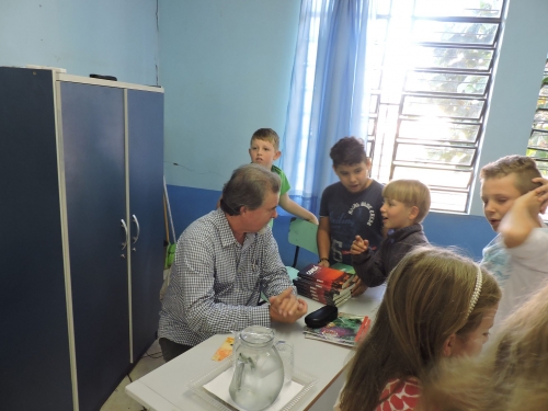 A Escola Estadual de Ensino Médio Rocha Pombo realizou nessa quinta-feira, dia 05 de julho, uma importante conversa com o escritor crissiumalense Marco Aurélio Nedel. Foi momento de grande interação com os alunos das séries iniciais, que por serem ávidos por saber muito perguntaram ao escritor sobre a sua obra infantil “O menino Condá e a Lenda do Lobo Mau.” Na conversa com as crianças o escritor falou sobre a lenda da mandioca, entre outras, enfatizando para que todos respeitem as questões que por hora podem causar divergências de opinião.