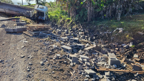Um acidente foi registrado por volta das 9h50 da manhã desta terça-feira (5), na RSC-472, na altura da Linha Turvo, entre os municípios de Três Passos e Tenente Portela, onde um caminhão-toco VW 13.180, de uma empresa três-passense carregado com blocos de concreto, saiu da pista, após um pallet, que portava os blocos, ter se desprendido e causado desequilíbrio da carroceria do caminhão.