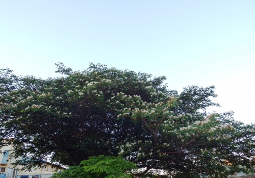 Dezenas de pássaros da espécie Beija-Flor fazem uma verdadeira festa em duas árvores em floração na frente da empresa.