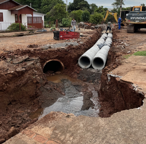 As obras de drenagem avançam na Rua Coroados, em Crissiumal. O trânsito está interrompido entre a Rua do Seminário e Rua XV de Novembro.
