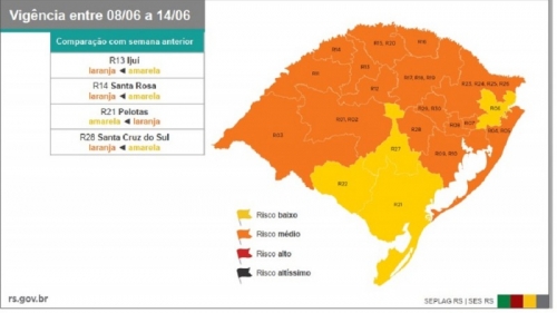 Das 20 regiões em que foi dividido o território gaúcho, três que estavam com bandeira amarela (risco baixo) passaram para laranja (risco médio): Ijuí (da qual Crissiumal faz parte), Santa Rosa e Santa Cruz do Sul. Na atualização divulgada neste sábado (6/6), apenas a região de Pelotas apresentou melhora, reduzindo de laranja para amarela.