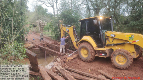 A Secretaria de Obras está atuando na recuperação da ponte do Lajeado Teimoso, danificada pelas fortes chuvas que atingiram o município.