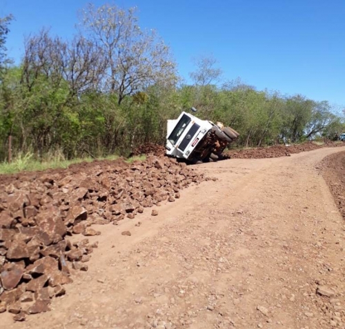 Um caminhão carregado de cascalho tombou na ERS 305, no interior de Crissiumal, na manhã dessa quinta-feira (06)..