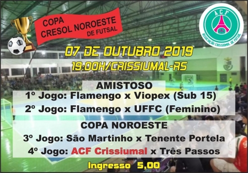 A grande atração desta segunda-feira (07/10) em Crissiumal é a rodada do grupo A da Copa Cresol Noroeste de Futsal.