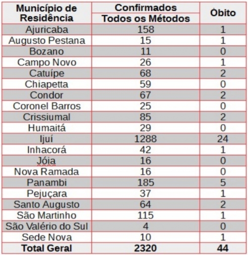 A região de abrangência da 17ª Coordenadoria Regional de Saúde chegou nessa terça-feira (06) aos 2320 casos de coronavírus. São 44 óbitos na região, que tem como principal município Ijuí e onde Crissiumal está inserido.