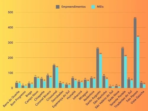 Do total, 1.538 (79,93%) são Microempreendedor Individual (MEI). Três Passos, Tenente Portela, Santo Augusto e Crissiumal, respectivamente, são os municípios da Região Celeiro com mais negócios neste formato.