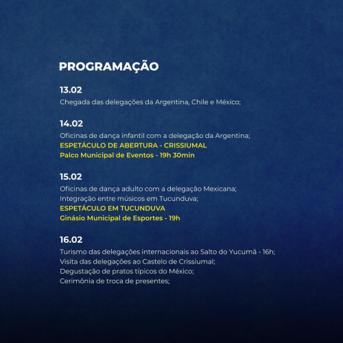 O GEMP divulgou neste final de semana a programação oficial e completa do 3º Festival Internacional de Folclore de Crissiumal, que irá acontecer entre os dias 13 e 22 de fevereiro, reunindo mais de 80 artistas de 04 diferentes nações.