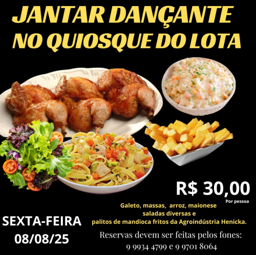 O Quiosque do Lota realiza nesta sexta-feira, dia 08 de agosto, Jantar Dançante ao valor de R$ 30,00 por pessoa.