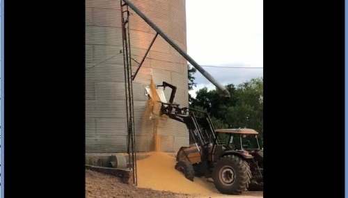 O sistema de armazenamento rompeu e passou a derramar grãos algum tempo antes de vir abaixo. A queda chegou a ser registrada em vídeo que circula nas redes sociais.