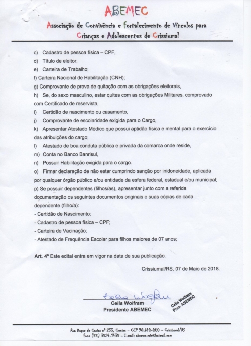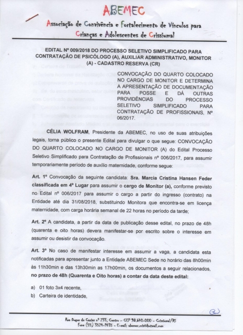 Editais - 08/05/2018 - Edital de convocação do quarto colocado no cargo de monitor da Abemec