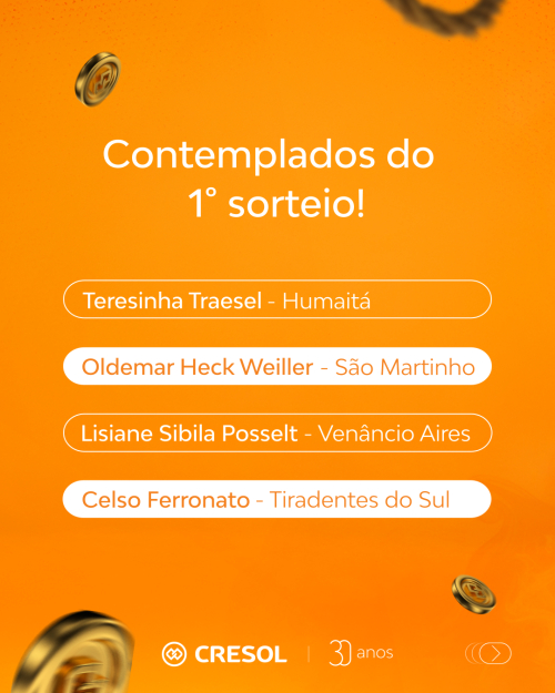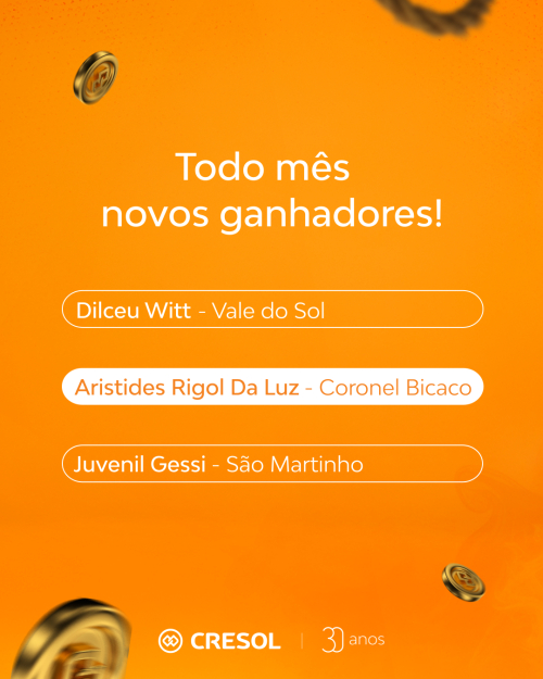 Ao longo dos próximos meses, a Cresol Cooperar continuará realizando 07 sorteios mensais de R$ 1500,00.